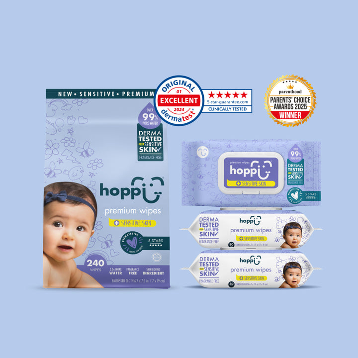 Hoppi™️Premium Sensitive Skin Wipes are specially designed for newborns and clinically tested by German dermatologists with Dermatest® 5-star certification, guaranteeing safety for sensitive skin, including babies. With 3.5x more hydration from over 99% pure EDI water, they are free from parabens, alcohol, and harmful chemicals. Gentle enough for oral use, non-irritating for daily use, and strong with a tear-resistant, zero-leakage design.